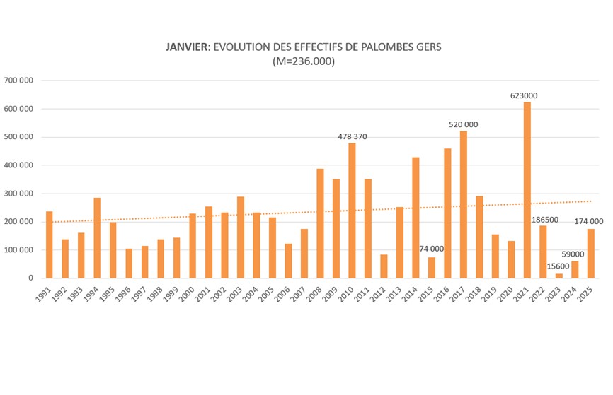 Comme pour le mois de décembre, l'hivernage de ce mois de janvier est correct pour le département ! Le nombre total de palombes observées (174 000) est malgré tout inférieur à la moyenne de ces 30 dernières années (236 000 palombes). Les oiseaux sont surtout présents dans le secteur de l'Armagnac (65%) et de l'Astarac (29%). Il semble que les récoltes tardives de maïs ont laissé des chaumes intacts pour le bonheur des palombes et de tous les oiseaux granivores !