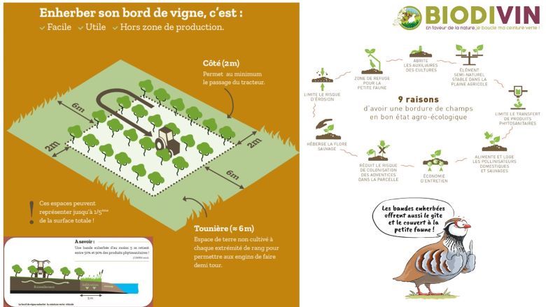 Les tournières, situées à chaque bout des rangées de vigne, constituent une interface non productive essentiellement utile à la circulation des engins. Cet espace représente environ 1/7ème de la surface totale du parcellaire et peut être enherbé pour bénéficier de plusieurs effets positifs : meilleure portance pour la circulation des engins, diminution de l'érosion, limitation de la pollution diffuse… L'enherbement permet aussi l'accueil d'une biodiversité végétale et animale plus importante. Il permet ainsi de répondre à diverses menaces : raréfaction du petit gibier, diminution des pollinisateurs et auxiliaires, menace de disparition des plantes messicoles et fragmentation des habitats.