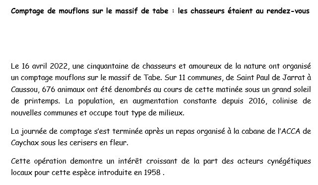 Retour aux actualités 03-05-2022 Comptage mouflons sur le massif de TABE Partager l'actualité Facebook X (Twitter) LinkedIn pinterest mail