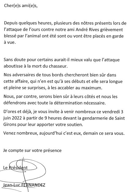 Communiqué du Président Fernandez relatif à une mobilisation de soutien aux personnes concernées par l'attaque de l'ours à Seix le vendredi 3 juin à partir de 9 heures devant la gendarmerie de Saint Girons.