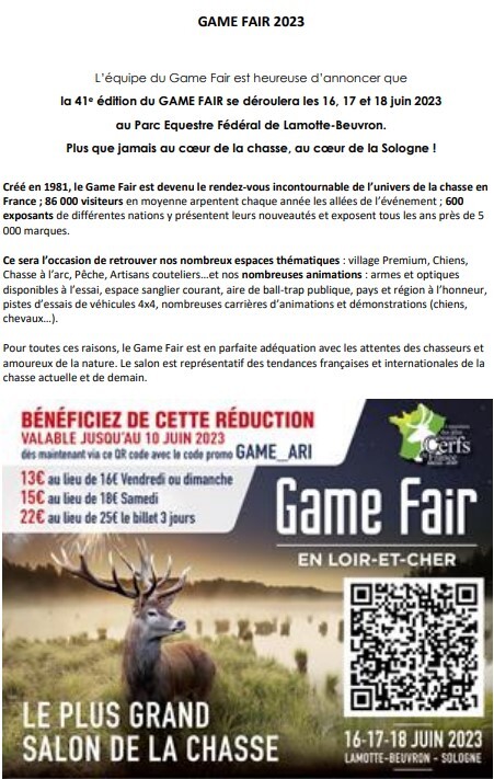 Retour aux actualités 26-02-2023 GAME FAIR 2023 Partager l'actualité Facebook X (Twitter) LinkedIn pinterest mail