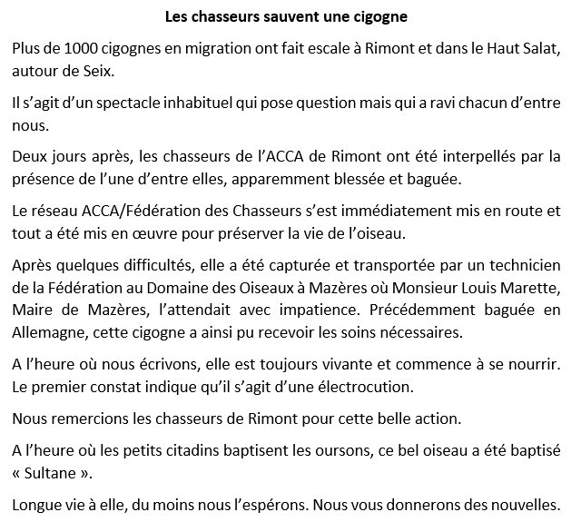 Retour aux actualités 12-09-2023 RIMONT: Les chasseurs sauvent une cigogne Photo: Christophe SIRGANT (ACCA de RIMONT) Partager l'actualité Facebook X (Twitter) LinkedIn pinterest mail