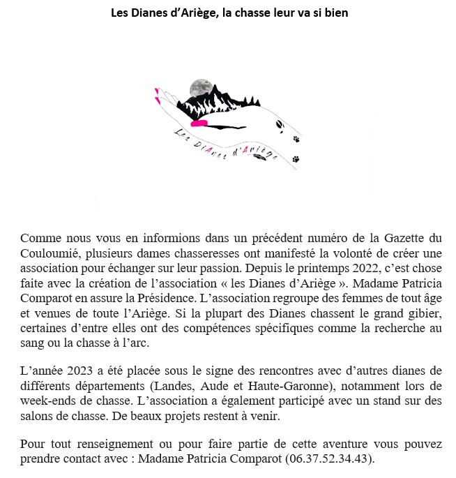 Retour aux actualités 21-09-2023 Les Dianes d'Ariège, la chasse leur va si bien Partager l'actualité Facebook X (Twitter) LinkedIn pinterest mail