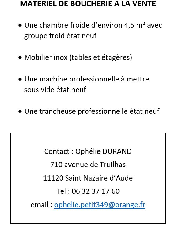 Retour aux actualités 18-10-2024 Matériel de boucherie à la vente Une annonce qui pourrait intéresser quelques ACCA. Partager l'actualité Facebook X (Twitter) LinkedIn pinterest mail