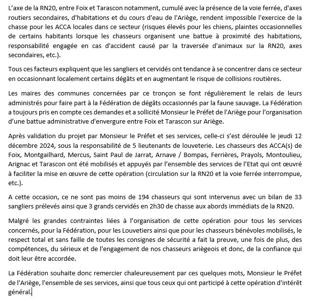 Retour aux actualités 07-01-2025 Battue administrative entre FOIX et TARASCON Partager l'actualité Facebook X (Twitter) LinkedIn pinterest mail