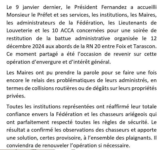 Retour aux actualités 16-01-2025 Battue administrative entre FOIX et TARASCON : Soirée restitution Partager l'actualité Facebook X (Twitter) LinkedIn pinterest mail