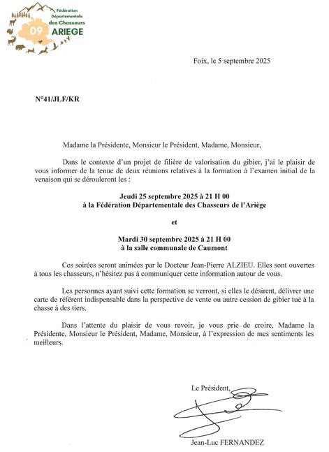 Retour aux actualités 06-09-2025 Formation à l'hygiène de la venaison Prochaines dates des formations à l'examen initial de la venaison Partager l'actualité Facebook X (Twitter) LinkedIn pinterest mail