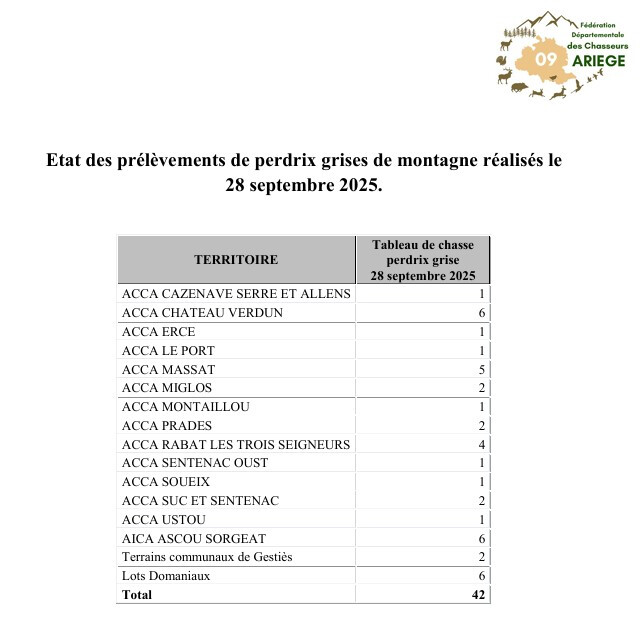 Retour aux actualités 30-09-2025 Prélèvements perdrix grises au 28 septembre 2025 Partager l'actualité Facebook X (Twitter) LinkedIn pinterest mail