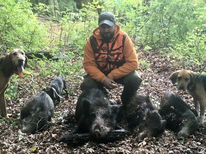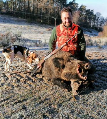 Bien connu des chasseurs du Nord Aveyron, le Président de la société de chasse de Saint-Amans-des-Côts, Nicolas Le Kervern a connu une belle saison. Tout d’abord en prélevant ce beau keiler de 94 kg à Saint Amans-des-Côts. On apprécie la photo, le travail de mise en valeur du sanglier et surtout la mine heureuse du chasseur. Un beau tir pour un beau cliché. Outre ce beau sanglier, Nicolas a également eu la joie de faire un quadruplé… Cette fois-ci, le théâtre de l’exploit se passe à St Symphorien. Être au bon endroit au bon moment c’est une chose, mais réussir à prélever en une seule battue 4 sangliers de 62, 44, 32 et 28 kg. Vous avouerez que c’est particulièrement beau.