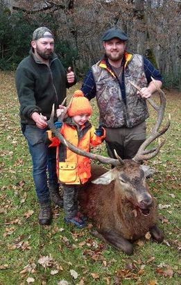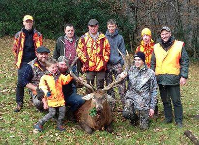 Aussi rien d’étonnant à ce que les beaux tableaux, les beaux animaux aillent à ceux qui sont régulièrement présents sur le terrain. Le reste, c’est du talent, savoir se positionner, savoir attendre, bien viser, bien tirer. Ce magnifique 14 cors a été prélevé en battue à Laguiole par Frédéric. Ce dernier conserve l’image d’un cerf présentant une magnifique allure et arrivant sur la ligne à pas de velours. On apprécie vraiment la photo de groupe avec les amis de la société de chasse et le bout de chou fier comme pas deux de poser à côté du cerf. Les honneurs sont rendus à l’animal. On note aussi l’effort de bien soulever la tête du cerf pour mettre en valeur le trophée. Trophée qui attend d’ailleurs sa cotation. Ce jour-là à Laguiole en plus de ce grand cerf il sera prélevé un petit cerf 6 cors, un daguet, un faon et une bichette qui sera retrouvée après une recherche au sang.
