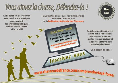 La Fédération départementale des Chasseurs de l’Aveyon recherche des chasseurs à l’aise avec l‘outil numérique pour créer une « task force numérique ». En effet, il nous faut être capables de nous mobiliser pour défendre nos droits et notre passion contre les « citadins antitout » qui à défaut d’être présents dans la nature maitrisent parfaitement la communication numérique.