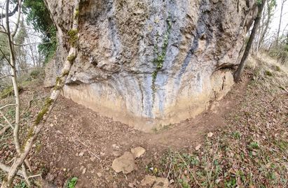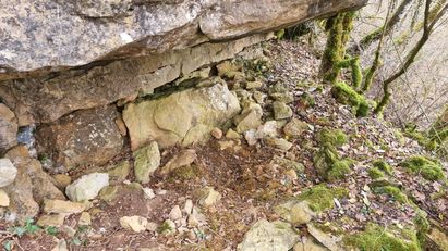 La surprise viendra surtout de la remise suivante. Arrivée sur place nous constatons que le bois indiqué par les points GPS est très clair. Point de pruneliers, ni de ronces. D’ailleurs, le bois est pâturé et située sur une pente très forte. Il y a là un terrier de blaireau et de très nombreuses sentes qui vont et qui viennent.Intrigués par le côté très ouvert du bois, nous nous décidons alors à suivre ces sentes avant d’arriver sous un éperon rocheux. Là nous remarquons 5 petites cuvettes creusées dans la terre bien à l’abri de la pluie protégées par le balcon rocheux. La remise de Nestor, est une remise collective bien abritée du vent et de la pluie. L’imprécision des points GPS tenait au fait que sous cette sorte de « remise sous grotte » la connexion avec les satellites devait peiner à se faire. Les housures sur la pierre témoignent également que le site, ne sert pas que de dortoir.