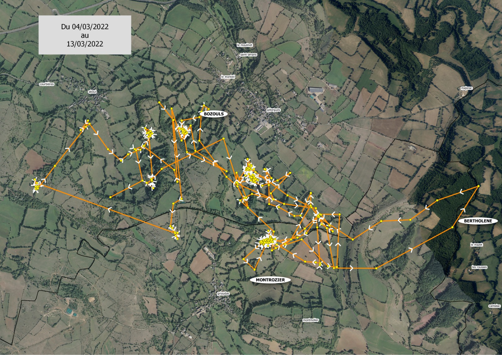 Nestor, notre sanglier équipé continue ses allées et venues sur un territoire qu’il exploite en fin connaisseur. Point divagation sur des km et des km en ligne droite, point de folles échappées difficilement compréhensibles. Non, Nestor connait son territoire par cœur, il y est né et il l’utilise au mieux. Ainsi, il change quasi quotidiennement de remise et utilise des sentes qui sont nettement individualisées. Là, le passage se fait sur un muret de pierre sèche qui s’est affaissé, ici Nestor passe sous un grillage à mouton soulevé, là il remonte un talus qui penche comme un toit pour atteindre directement un bois. C’est un réel plaisir que de suivre son parcours.