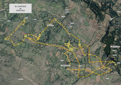 De là Nestor est reparti vers la 5ème remise du côté de Zenières dans le secteur des Costes. Une haie large et dense a accueilli notre sanglier avant qu’il ne retourne vers la remise numéro 1. On retiendra que le 19 mars Nestor était en jambes. Il a parcouru de remise à remise un peu plus de 9 km. En revanche, le 17 mars il devait avoir les jambes lourdes, car il n’a parcouru que 2.8 km. En moyenne il se déplace de 5.3 km par jour. Pour vous donner plus de chiffres, Nestor passe énormément de temps dans ses remises. L’heure du coucher a eu lieu, tenez-vous bien entre 0 h 00 et 2 h 00 du matin et dure jusqu’à 17 h 30 – 18 h 00. Une fois encore, certainement très occupé par quelques activités il s’est remisé à 4 h 30 pour en partir vers 18 h 00 … et c’est comme cela quasiment tous les jours. |