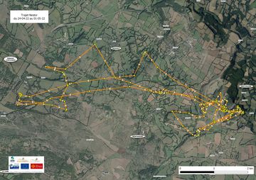 Nestor est resté actif pendant plus de 30 heures d’affilée, sans pour autant couvrir une distance exceptionnelle, mais pendant 30 heures il est resté constamment sur pied. Un départ depuis le secteur de Banc sur la commune de Bertholène en direction de Gillorgues sur la commune de Bozouls. Il a fait ensuite un crochet pour éviter Aboul et il a quitté le bocage bozoulais pour rejoindre le plateau du causse Comtal. Là il est retourné sur Vayssettes toujours sur la commune de Bozouls puis a rejoint le secteur du champ du capitaine sur la commune de Gages-Montrozier. Il en est reparti presque aussi sec non sans avoir un peu retourné de la terre dans les pelouses sèches. Il a ensuite pris la direction de Curlande et une nouvelle fois a fait un crochet pour éviter le secteur d’Aboul…quelqu’un ou quelque chose lui ferait-il peur dans ce paisible hameau ? Toujours est-il que Nestor a terminé son périple vers l’Est à Banc sur la commune de Bertholène avant de repartir et de mettre le cap à l’ouest pour se reposer cette fois-ci non loin de la caisse régionale du Crédit Agricole…