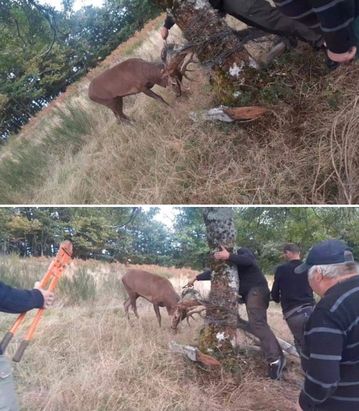 Seulement voilà, le cerf ne comptait pas se laisser libérer aussi facilement. Il avait tenté son va-tout pour s’en sortit et avait réussi à arracher plus de 10 m de grillage. Il était donc impossible de l’approcher à moins de 10 m sans prendre un risque inconsidéré. La force et la colère étant du côté de l’ongulé, les chasseurs ont dû ruser. Tantôt en l’effrayant, tantôt en servant de cible ils ont fait tourner le cerf autour d’un arbre, toujours dans le même sens. Petit à petit, sans s’en rendre compte le cerf réduisait sa marge de manœuvre. Quand notre cerf eu finit d’enrouler le grillage autour de l’arbre, il n’avait plus autant de latitude pour charger. Alors, courageusement, les chasseurs de Pomayrols à l’aide de cordes ont réussi à immobiliser le 12 cors et ont pu couper le grillage.