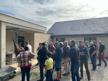 Aussi, pour l’occasion, la Fédération Départementale des Chasseurs de l’Aveyron avait prévu un sanglier mort percuté par une voiture. Un cas d'école. Il importe de souligner que l’après-midi Guillaume a été magnifiquement assisté de Marcellin Bonnays. Le boucher de Saint Chély en sait long sur la manière d’éviscérer un gibier dans les règles de l’art, de parer la zone atteinte par les projectiles et de découper un gibier.