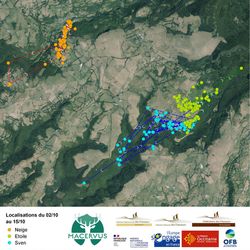 Étoile quant à elle, elle est restée longtemps dans le bois de la Bosse en compagnie de Sven. N’insistez pas, nous n’en savons pas plus, mais tous les deux ont passé plusieurs jours ensemble sans sortir du bois. Puis elle est montée au Puech de la bosse passant plusieurs jours également dans les fougères aigle et les Genets, avant de rallier le Martinet juste au-dessus du lac des Picades.