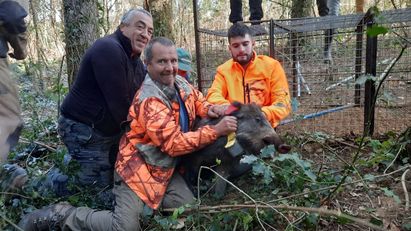 Il s’est pris au piège à 1h40 du matin. Quand Maxime Gaubert a reçu l’alerte sur son téléphone, il a sonné le rassemblement pour s’organiser au petit matin. C’est ainsi, que 6 chasseurs de l’équipe de Camjac/Rulhac/Centres/Saint-Just Viaur sont venus prêter main-forte pour immobiliser la bête noire le temps de lui passer le collier GPS autour du cou.