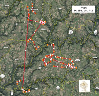 Phiphi est passé sur pas moins de 7 communes en 10 jours. De toute évidence, la chasse y est pour beaucoup dans ces déplacements. Il a franchi plus de 20 fois des routes. Assurément, Phiphi est sur pied.
