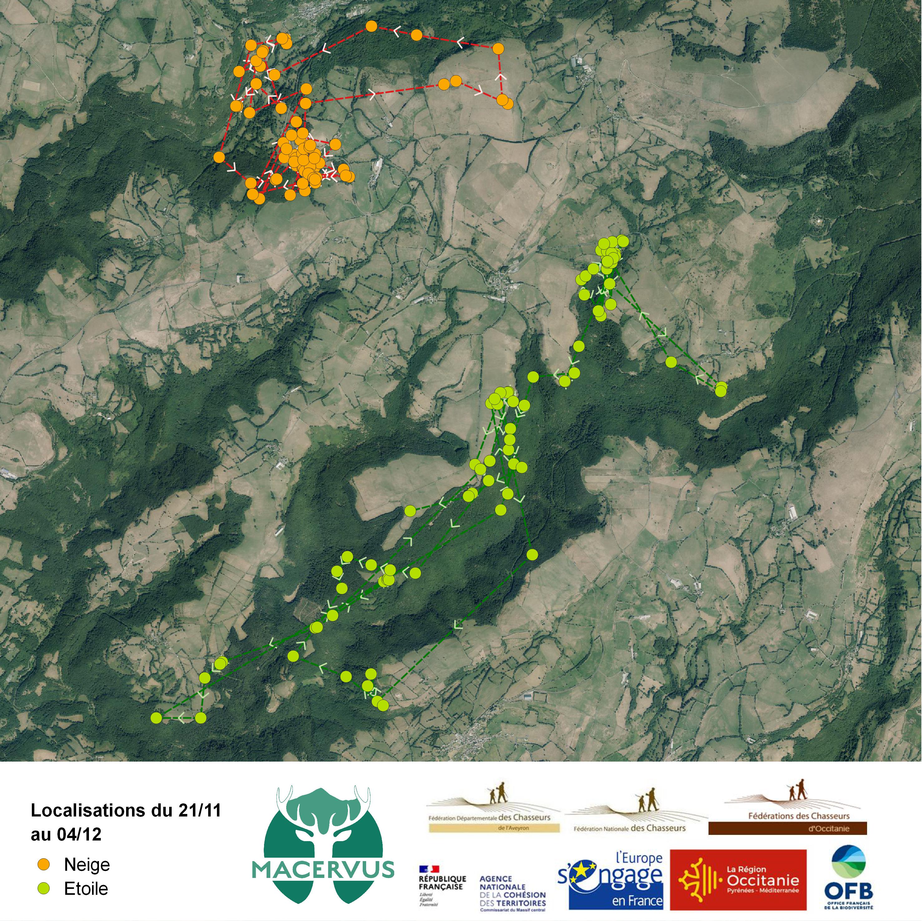 Avec Etoile, c’est une autre musique. Elle évolue de Castelnau de Mandailles à la Bosse le plus souvent en rive droite, assez rarement en rive gauche du ruisseau des Mousseaux. Elle vit quasi en permanence dans la forêt et ne fait que quelques incursions dans les prairies. Tout le temps de nuit. Le GPS ne la donne jamais à plus de 20 m de la forêt. Il faut dire que le secteur est régulièrement chassé et certains de ses déplacements sur de longues distances indiquent sûrement un dérangement à un moment donné. Il y a là une donnée importante à considérer dans la différence d’attitude entre nos deux biches équipées. Au final Neige a parcouru un peu plus de 1300 m par jour quant Etoile a réalisé des déplacements de plus de 2200 m par jour.