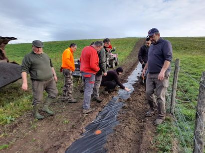 Les chasseurs de l’entente Comps-la-Granville, Salmiech et Cassagnes-Begonhes sont venus prêter main-forte à Fabien et Pierre Vieilledent pour planter 300 m de haies. Pierre et Fabien sont exploitants en ovin-lait et en bovin viande à Salmiech. Pierre est chasseur et Fabien son fils compte bien passer son permis de chasser prochainement.