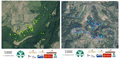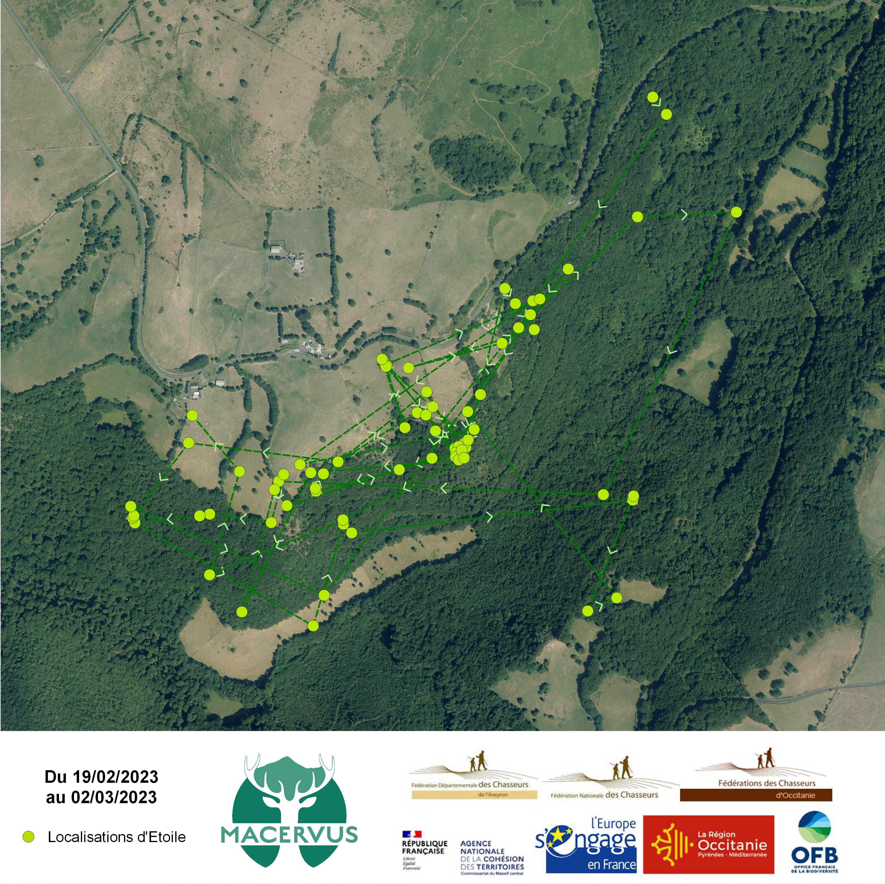 Étoile est désormais la seule biche à porter un collier GPS puisque celui de Neige est tombé, comme prévu après avoir totalisé près d’une année de bons et loyaux services. Elle est revenue à ses premiers amours, au niveau du bois de la Bosse. Toujours en rive droite du ruisseau des Mousseaux. Cependant pour la première fois depuis que nous la suivons, elle a fait une incursion en rive gauche en allant jusqu’au Couderc. Étoile a parcouru moins de 15 km en 10 jours avec une moyenne inférieure à 1.2 km par jour. Sven de son côté a arpenté près de 24 km en 10 jours avec une moyenne tout juste inférieure à 2 km par jour.
