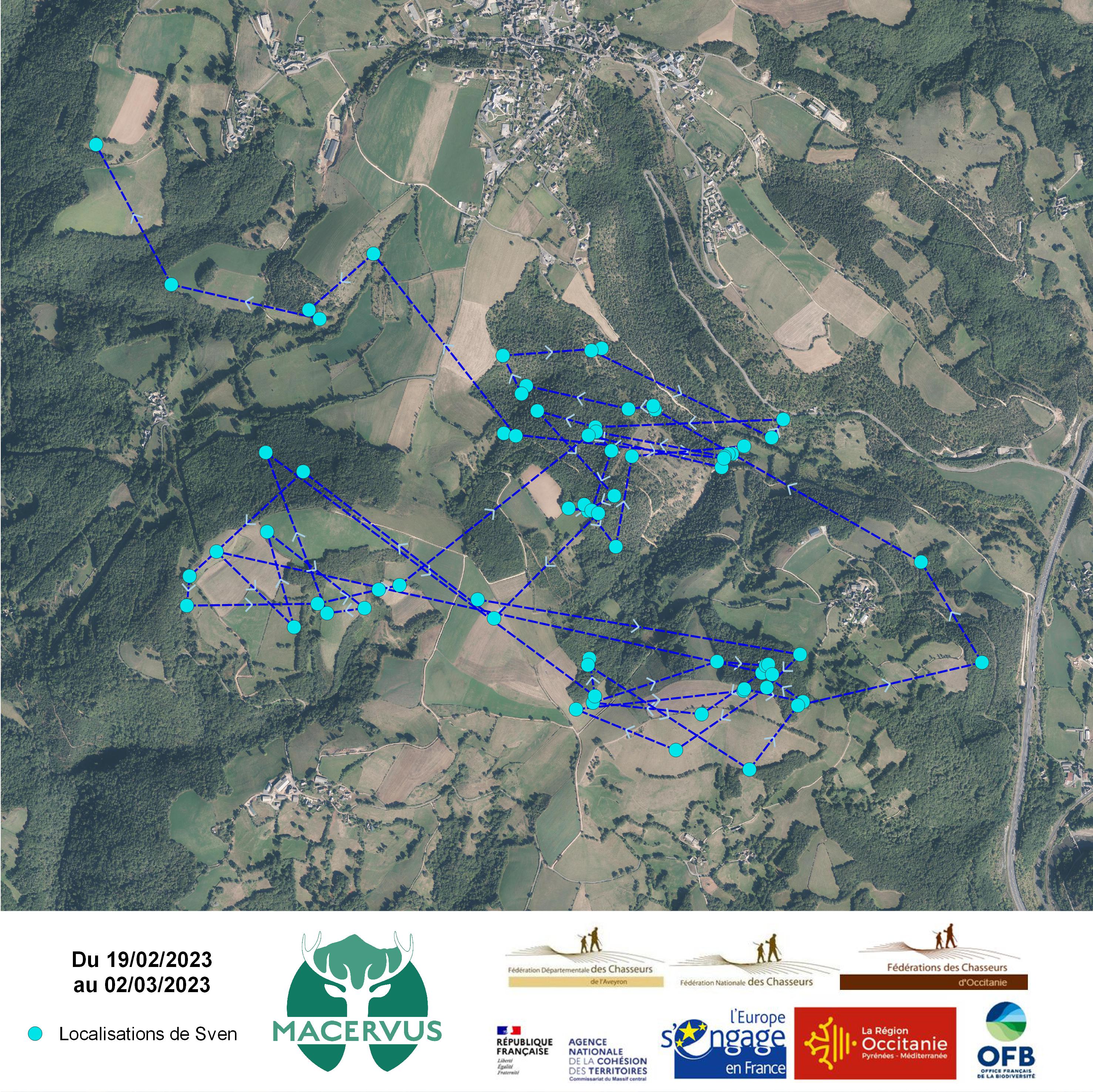 Sven, notre cerf équipé, poursuit ses pérégrinations en Lozère sur Saint-Germain-du-Teil. Après avoir tourné et retourné encore il s’est décidé à prendre la direction l’ouest. L’Aveyron lui tend les bras. Cependant, sans aller très loin non plus. L’avenir nous dira si s’agit d’un azimut assumé vers la terre promise ou d’une simple tocade. Toujours est-il qu’il a tombé ses bois et qu’il serait accompagné de 3 autres mâles. Sans certitude totale cependant. En effet, un observateur lozérien parmi les plus aguerris à l’approche du cerf s’est rendu au plus près des animaux, mais n’a malheureusement pas eu le temps de voir le collier. Le collier a très rarement borné en milieux ouverts. Que ce soit de jour ou de nuit nous, ne disposons que de 13 données en prairie contre 67 en bois. Et toutes les données en milieu ouvert sont toujours en lisière de forêt.