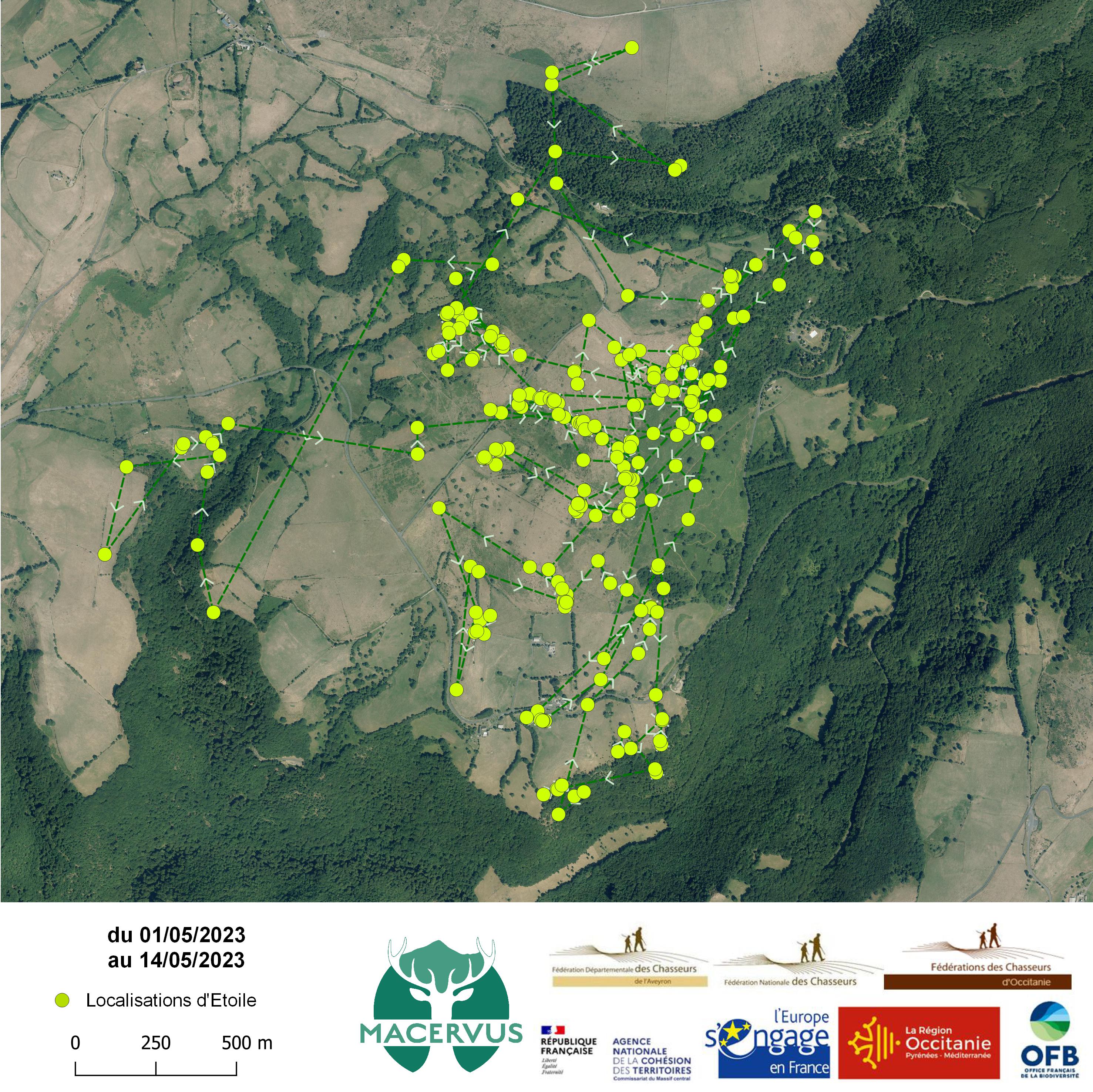 Étoile de son côté, continue de tourner rond. Tantôt sur Prades d’Aubrac, tantôt sur Saint Chély-d’Aubrac…elle s’est même fait tirer le portrait par Clément Gimenez que nous remercions chaleureusement et félicitons pour avoir réussi ce beau cliché. À la différence de Sven qui n’a que très rarement quitté le fermé, étoile a passé beaucoup de temps dans les genêts et les prairies. Le programme « Macervus » nous permet d’en apprendre tous les jours un peu plus sur le comportement des cervidés. Il reste encore deux colliers à passer au cou de deux mâles. On croise les doigts pour y arriver.