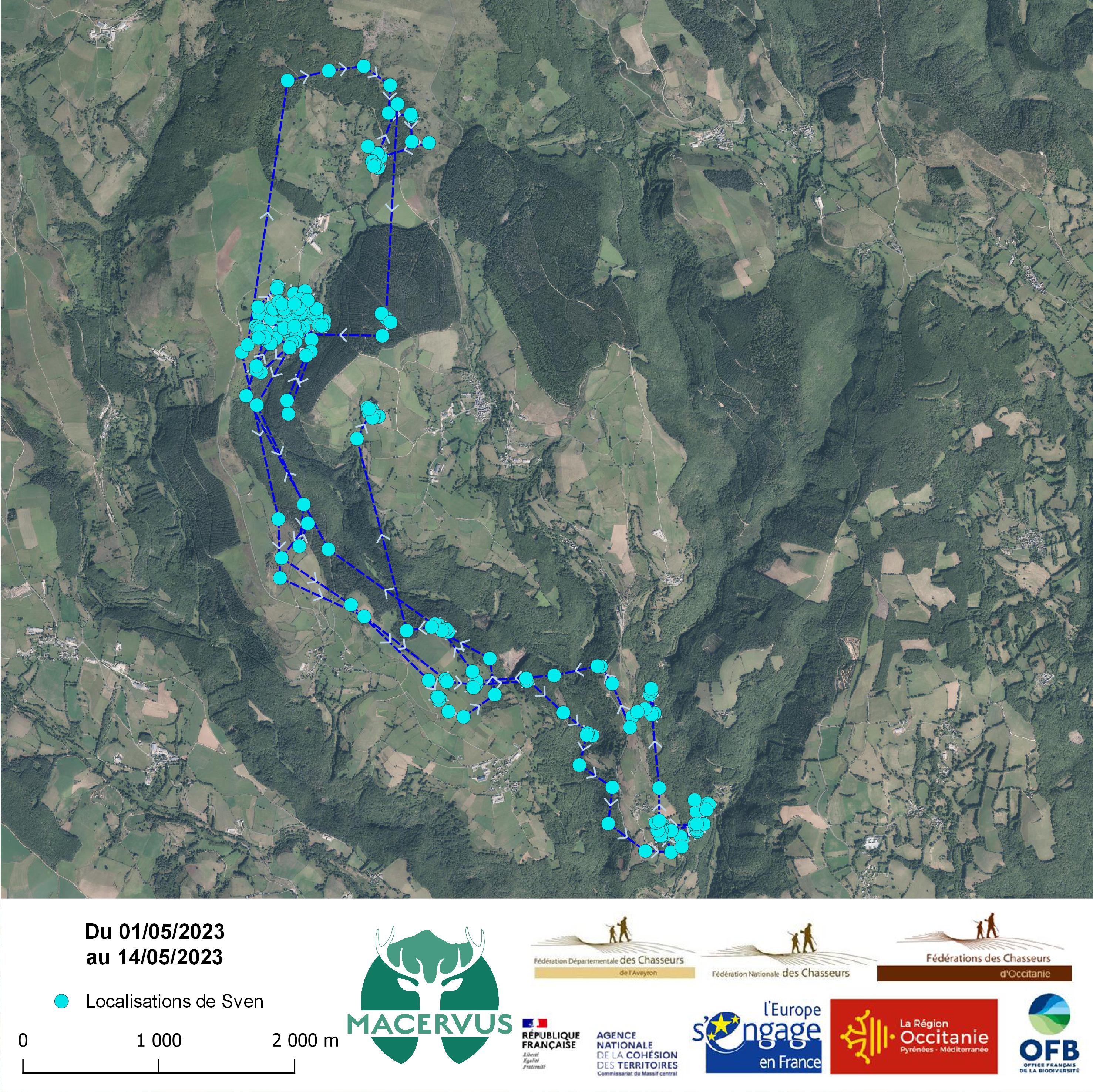 Sven se rapproche de l’Aveyron. Il semble avoir laissé derrière lui Saint-Germain-du-Teil. Il est désormais du côté des Hermaux. Il est monté jusqu’au Truc del Biaou puis il est revenu au Puech Anis. Il n’a pas chômé puisqu’il a parcouru près de 40 km en 10 jours. Avec une moyenne de 3 km par jour, notre cerf équipé semble être sur pied. Il ne faut pas croire qu’il déambule au hasard, il est en pays connu, partout où il est passé ces derniers jours il était déjà passé l’an dernier. En fait, petit à petit, il fait le chemin inverse. Il connaît donc particulièrement bien le territoire et il sait où il va et il sait ce qu’il cherche.