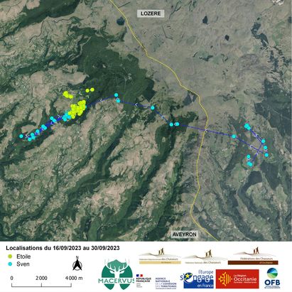 Il ne s’y est pas trompé, il était là à l’heure. Même au dire des techniciens, un tout petit peu en avance pour le grand bal. Non il n’est pas revenu pour l’herbe plus verte. Certainement pas pour la quiétude des bois. Cela n’aura échappé à personne, le brame a commencé et Sven veut sa part de biches. Il a quitté la Lozère du jour au lendemain il a parcouru en la vingtaine de km qui le séparait de ses places de brames. Au passage il a croisé la biche équipée « Neige ». Et le GPS nous dit qu’ils sont toujours ensemble. À suivre.