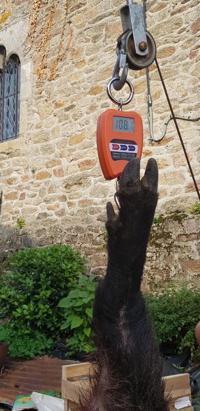 Cela, les chasseurs de l'entente entre Manhac, le plateau de Moyrazes et Boussac l'ont bien compris. Et ils ont revu leurs classiques et se sont mis à chercher là où spontanément on n'aurait pas mis un chien de pied. Pour l'histoire Phiphi a été remisé sur Manhac et on le doit à Renaud et à Francis. Il a été levé par Gilles, Renaud et Jacky avec les chiens des chasseurs du plateau de Moyrazes et il a été tué par deux postés de Boussac. Vous avez dit entente ?! Difficile de faire mieux ! C'est Christian et Patrick qui tirent. Les deux touchent. Au final Phiphi que nous avions équipé d'un collier GPS à 40 kg en 2022 pesait 108.10 kg en 2024.