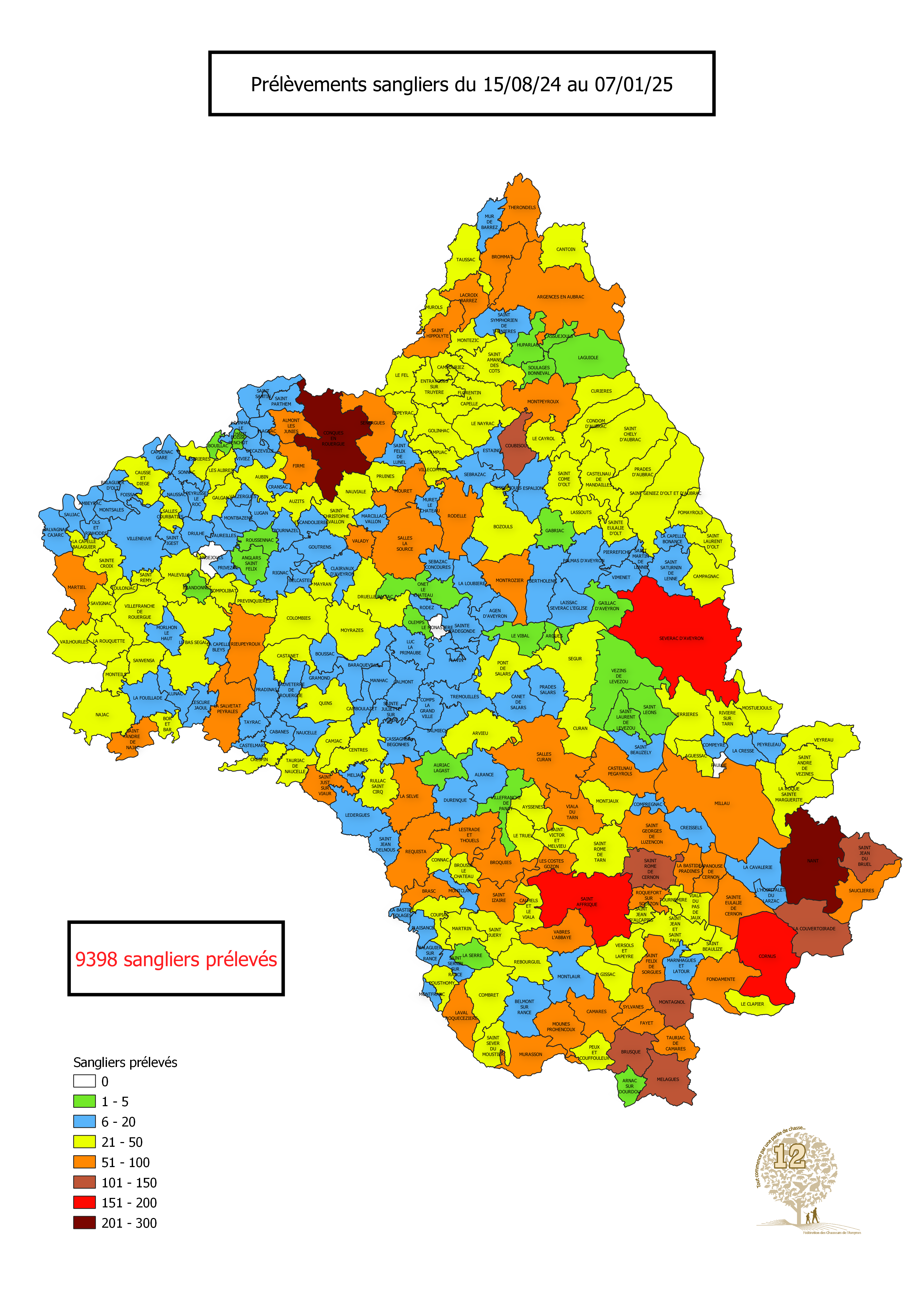 Voici la nouvelle carte des prélèvements de sangliers pour le département de l'Aveyron. Désormais, rares sont les communes où il ne s'est pas tué au moins un sanglier. On note que le sud du département reste un haut lieu de la chasse aux suidés avec une commune qui a dépassé les 200 sangliers inscrits au tableau et plusieurs communes flirtent désormais avec cette barre symbolique. Bien évidemment, les communes nouvelles qui regroupent plusieurs communes apparaissent dans le haut du classement, mais là, il importe de relativiser. Il sera intéressant à l'issue de la saison de croiser ces éléments avec les données de terrain (pentes, vallées, gorges et surfaces forestières).
