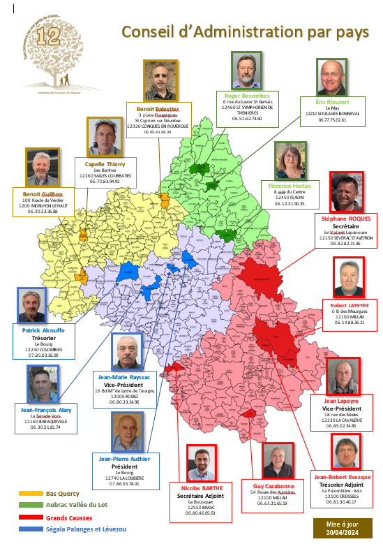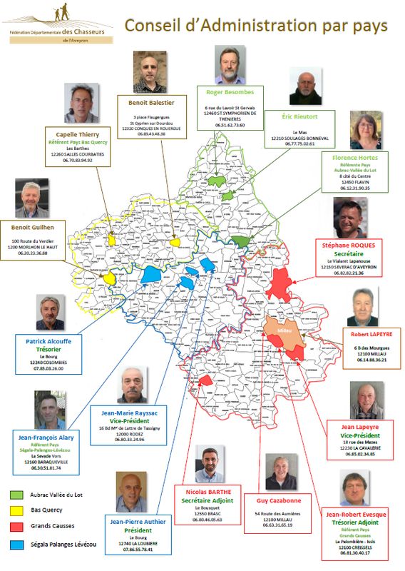 les 16 membres assurent une représentation géographique dans les 4 pays cynégétiques définis sur le département du Aveyron.