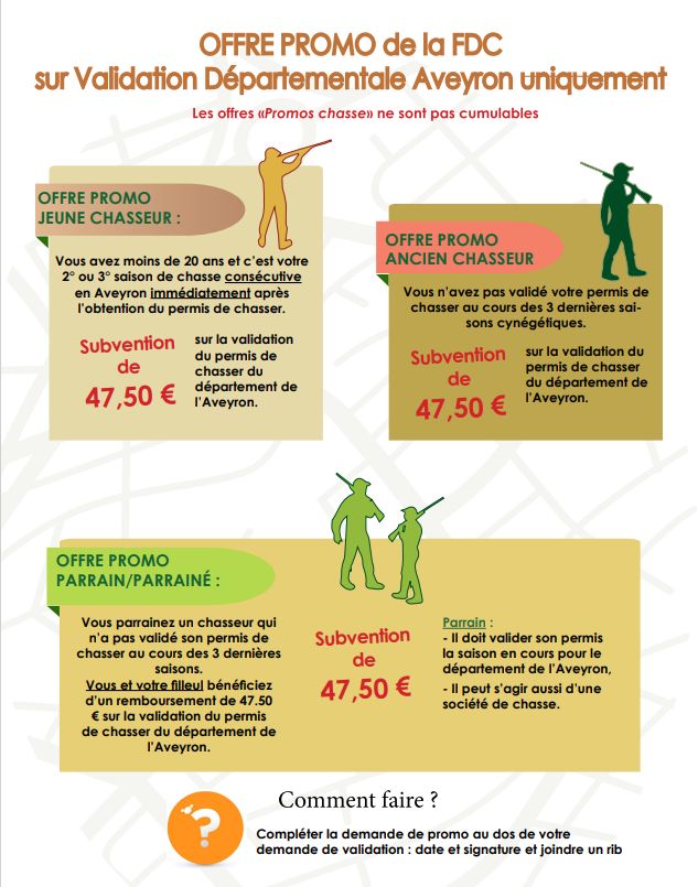 Tout chasseur ayant validé son permis de chasser pour le département de l'Aveyron, lors de la campagne précédente, et qui connaît un autre chasseur qui n'a pas renouvelé son permis depuis plus de 3 ans. L'un et l'autre bénéficient d'une remise de 47,50 € du prix du timbre fédéral sur leur validation départementale Aveyronnaise du permis de chasser.