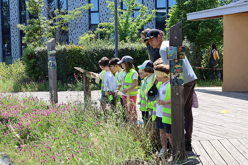 Espace extérieur : îlot de biodiversité constitué d'une mare pédagogique, d'un muret en pierre sèche (réalisé par le lycée Agropolis) et d'une jachère fleurie, sentier ludo-pédagogique sur la biodiversité