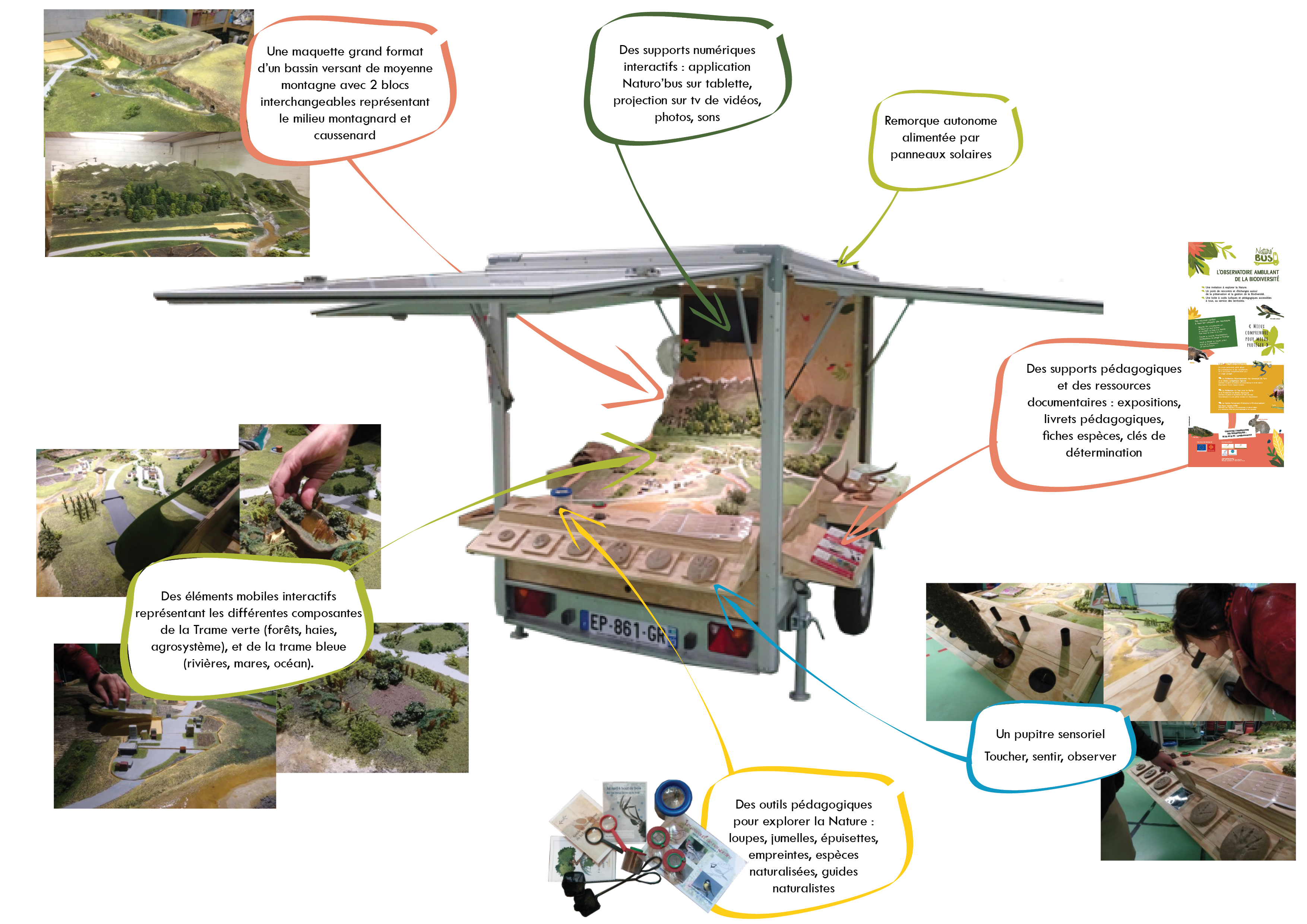 A la manière des bibliobus, véritable boite à outil ludique et modulable, le Naturobus part à la rencontre des citoyens pour faire découvrir au plus près des territoires, la biodiversité locale et questionner tous les publics sur les enjeux liés à l'aménagement du territoire et à la gestion des espèces et des milieux.