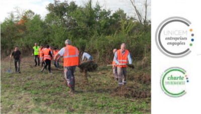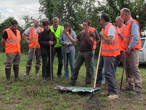 Les professionnels des industries des carrières, équipés de râteaux et de pelles, sont ainsi intervenus sur les pourtours de la mare pour récupérer les produits d'un gyrobroyage récent et les exporter quelques mètres en aval du site. Cette action permettra d'éviter le retour de ces matières végétales dans la mare lors des pluies hivernales et ainsi éviter l'eutrophisation (sur-enrichissement) de ce milieu au printemps lorsque ces matières végétales se décomposeront.