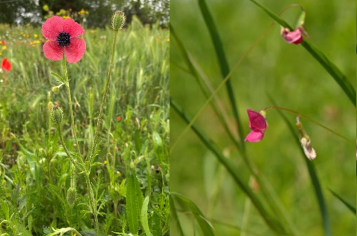 A gauche : Papaver hybridum dans la bordure de la parcelle Aude_P4 (Corbières) ; à droite Lathyrus nissolia dans la bordure de la parcelle HP_P2 (Madiran).
