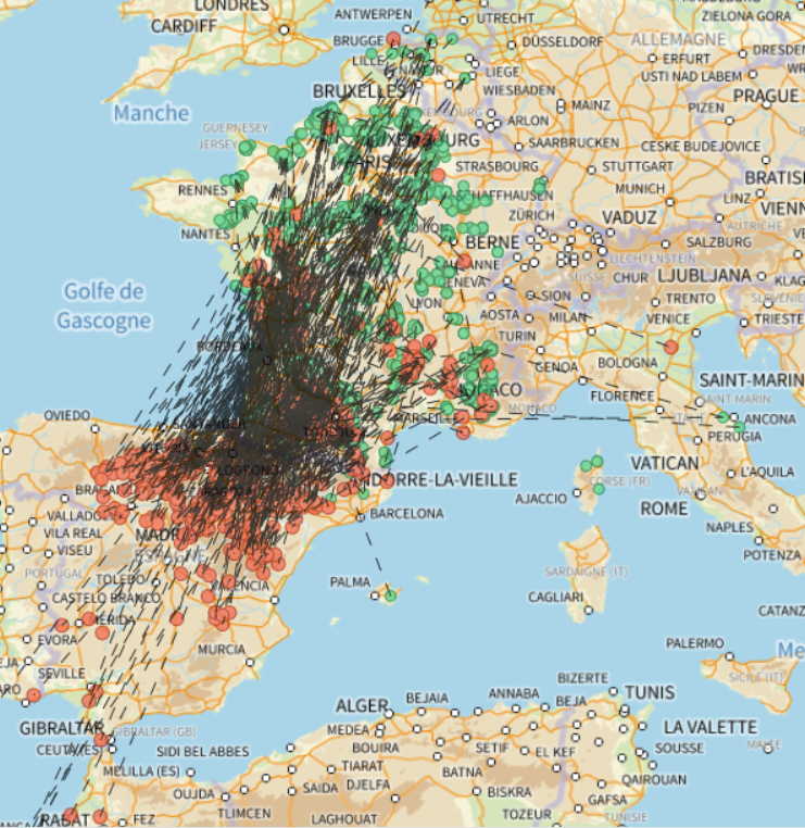 En vert, les oiseaux bagués, en jaune, les contrôles, en rouge, les reprises. Les traits joignent le lieu de baguage à celui de contrôle ou de reprise.