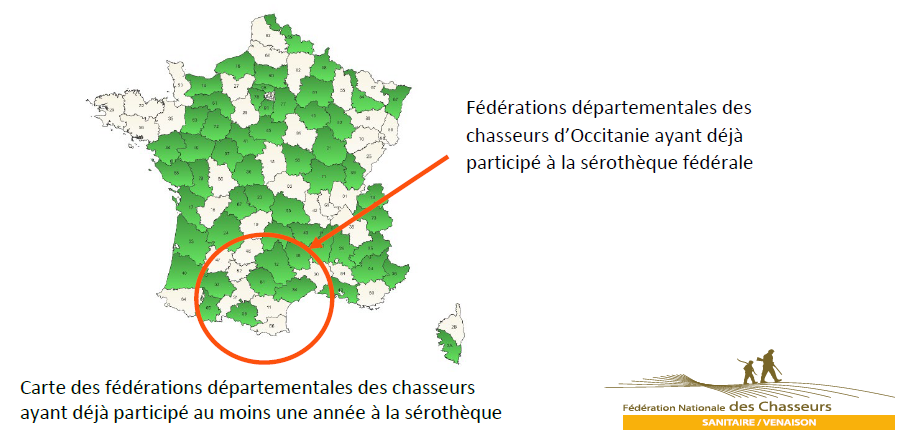 Plus de 55 fédérations des chasseurs ont participé au moins une année à cette sérothèque nationale (cf carte ci-dessus), soit près de 40 000 prélèvements réalisés et conservés.