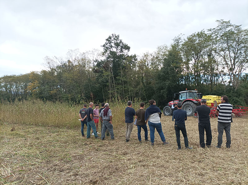 La démonstration s'est déroulée sur une parcelle en couvert d'interculture estival (sorgho fourrager et radis chinois) semé à la volée avant la moisson de l'orge. Cette pratique est mise en œuvre depuis plusieurs années dans le cadre du programme Agrifaune, pour ces intérêts agronomiques, économiques et environnementaux.