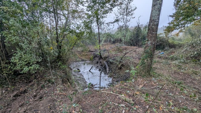 Nichée dans un petit massif boisé entouré de cultures, cette mare était fortement embroussaillée, encombrée de branches mortes et comblée par un important dépôt de sédiments.