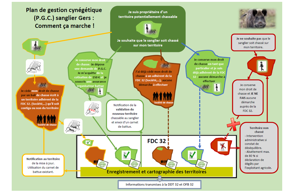- Aucune démarche n'est nécessaire pour chasser le sanglier quand ces territoires sont déjà des adhérents territoriaux de la Fédération Départementale des chasseurs du Gers et donc bénéficiaires d'une attribution de grand gibier (chevreuil, cerf ou daim) au plan de chasse annuel.