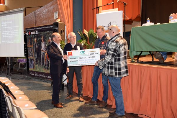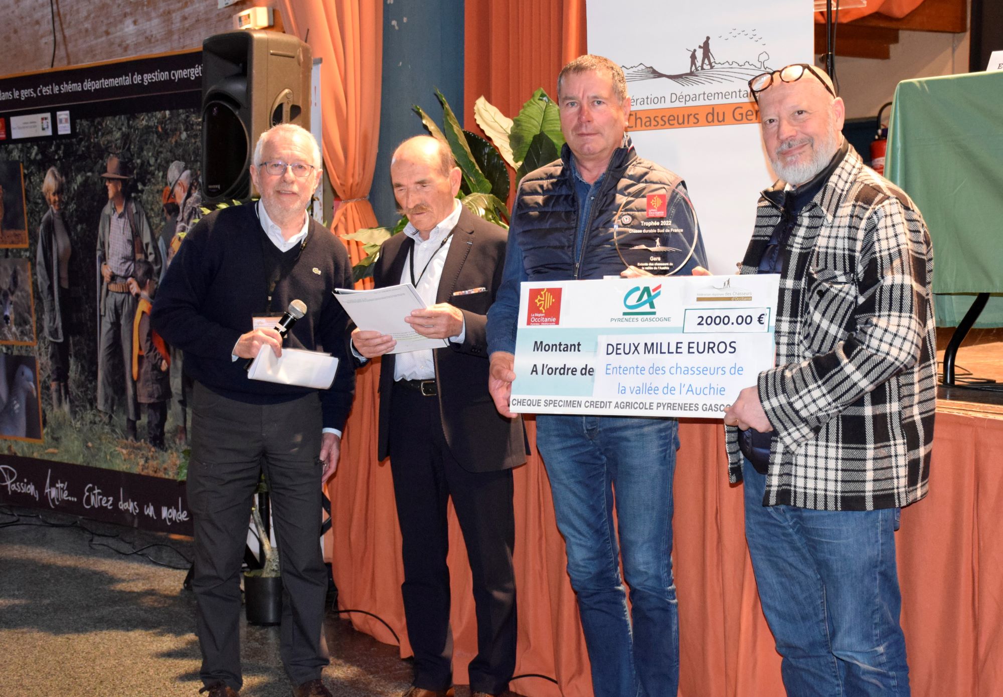 Le samedi 15 avril lors de l'Assemblée Générale de la Fédération Départementale des Chasseurs du Gers, M. Serge CASTERAN et M. CARPENTIER René ont remis le Trophée Chasse Durable 2022 et un chèque de 2 000 € à Messieurs DENTELLA Daniel et KAWAN Éric, respectivement président de la société de chasse de Marsolan et président de la société de chasse de Larroque-Engalin.