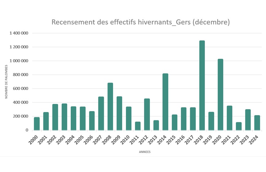 Le mercredi 18 décembre, 204.000 palombes ont été comptées dans le Gers. C'est un bilan inférieur à l'an passé à pareille époque (290.000). Les palombes sont surtout présentes dans l'Armagnac (124.000 palombes) sans pour autant observer de grosses concentrations d'oiseaux. On remarque dans ce secteur que la plupart des chaumes de maïs sont encore en place en raison des intempéries. C'est probablement ce qui favorise le stationnement des palombes comme l'an passé. Pour l'Astarac, 47 000 palombes ont été comptées, c'est manifestement moins que ces dernières saisons et pour la vallée de l'Adour, on enregistre 33 000 palombes.