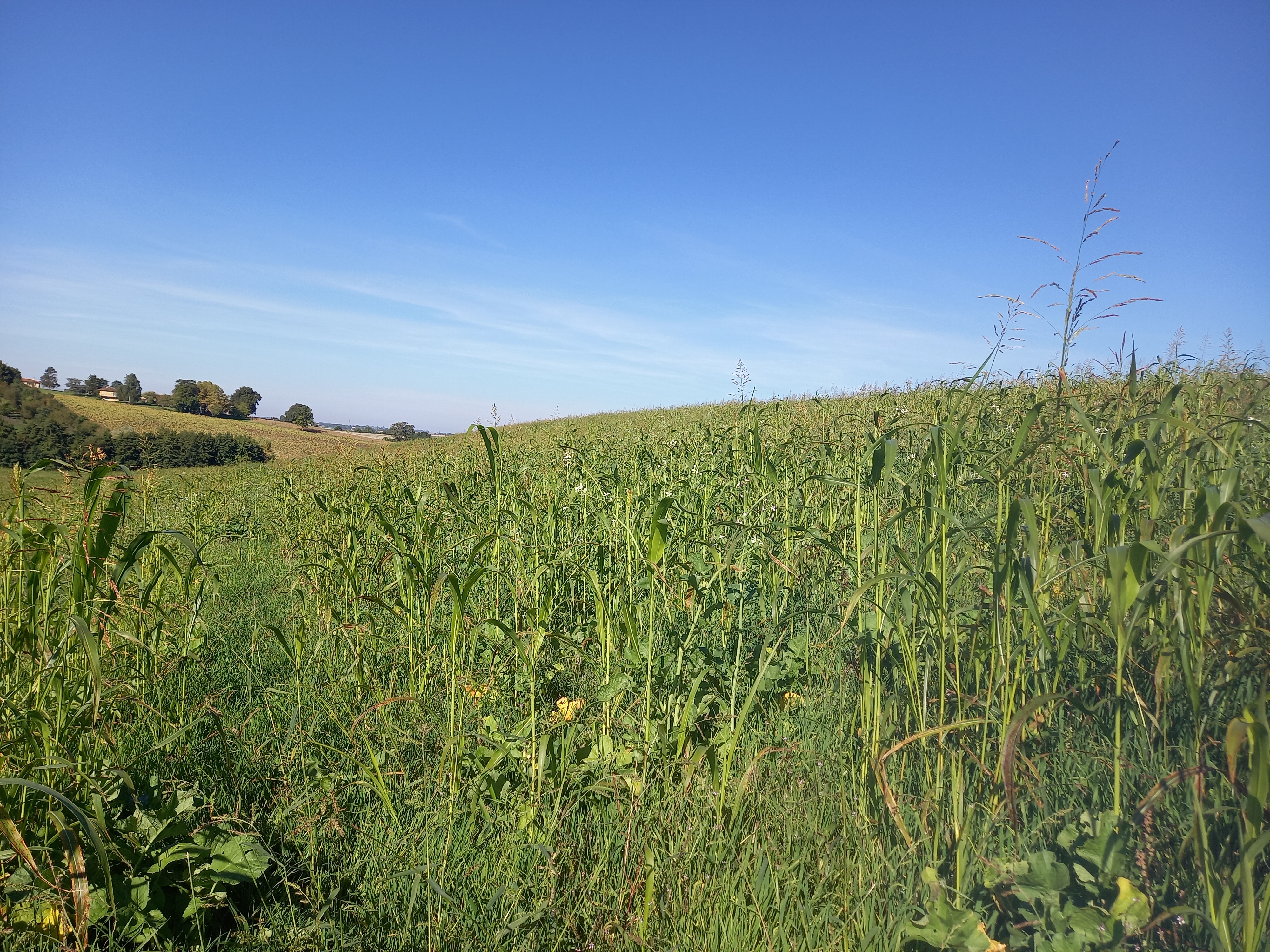 Certains mélanges, notamment le sorgho fourrager associé au trèfle violet, se distinguent par leur forte production de biomasse, leur excellente couverture du sol et leur intérêt écologique pour la faune et les pollinisateurs. Pour la campagne 2025, un nouveau mélange associant sorgho fourrager, radis fourrager et vesce a été testé. Malgré l'absence de pluie, le couvert a réussi à lever sur certaines parcelles, témoignant de la résilience de la technique face aux conditions climatiques contrastées. Ce mélange d'espèces permet d'assurer un relais jusqu'à sa destruction au printemps pour une reprise du sol et un semis de tournesol, maïs ou soja. Cet itinéraire s'adapte bien à des sols relativement légers comme sur les parcelles que nous suivons sur le territoire de l'Astarac.