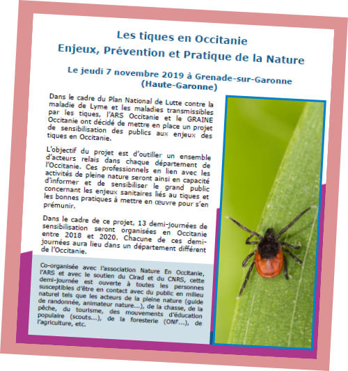 Dans le cadre du Plan National de Lutte contre la maladie de Lyme et les maladies transmissibles par les tiques, l'ARS (Agence Régionale de Santé) Occitanie et le GRAINE Occitanie ont décidé de mettre en place un projet de sensibilisation des publics aux enjeux des tiques en Occitanie.