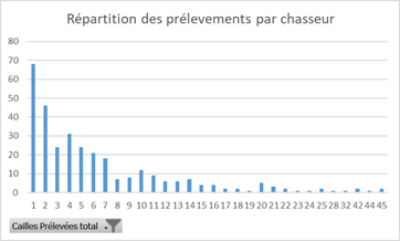 Le graphique met en évidence que la majorité de ces chasseurs ont prélevé entre 1 et 4 cailles, et qu'au-delà de 10 cailles les chasseurs sont peu nombreux.