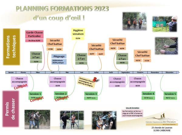 Le calendriers des formations proposées en 2023 par la Fédération des Chasseurs de la Haute-Garonne est disponible, suivre les liens pour consulter chacun d'eux.